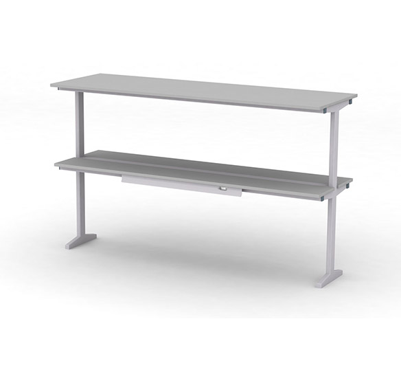 Сервисная надстройка островного типа представляет собой функциональное решение для организации рабочего пространства. Конструкция основана на прочном сварном каркасе из стальных прямоугольных труб, обработанном износостойким эпокси-полиэфирным покрытием светло-серого цвета с текстурой шагрень, что обеспечивает надежную защиту от коррозии и механических повреждений.