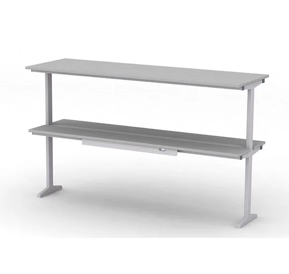 Сервисная надстройка островного типа создана на основе прочного сварного каркаса из стальных прямоугольных труб. Каркас защищен эпокси-полиэфирным порошковым покрытием светло-серого цвета с текстурой шагрень, что обеспечивает устойчивость к коррозии и механическим повреждениям. Конструкция оснащена двумя функциональными полками из ламината высокого давления толщиной 16 мм. Данный материал представляет собой влагостойкую фанеру, облицованную химически стойким пластиком, что обеспечивает устойчивость к механическим воздействиям и кратковременному контакту с неконцентрированными кислотами, щелочами и органическими растворителями. Полки выполнены без бортика и обладают относительной влагостойкостью, при этом не рекомендуется их длительное термическое воздействие.