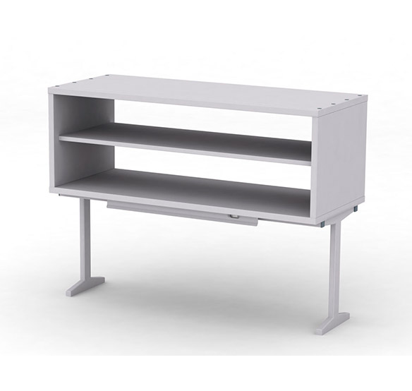 Конструкция включает стальной шкаф без дверей, выполненный в едином с каркасом цветовом решении. Внутреннее пространство шкафа оборудовано одной регулируемой по высоте полкой, что позволяет рационально использовать объем для хранения.