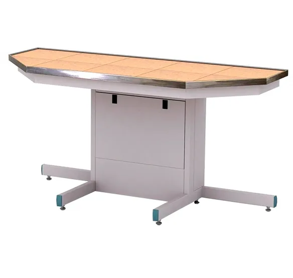 Материал рабочей поверхности стола – керамогранит (плитка 600х600 мм, плитка 300х300мм). Обладает высокой стойкостью к химическим, термическим и механическим воздействиям. По устойчивости к воздействию химических веществ значительно превосходит ламинатные покрытия. Стойкий к длительному воздействию высоких температур. Поверхность обрамлена бортиком из нержавеющей стали.