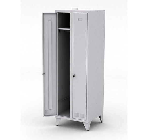 Шкаф для одежды представляет собой разборную контракцию, изготовленную из листовой стали окрашенной эпокси-полиэфирной порошковой краской светло-серого цвета с текстурой шагрень.