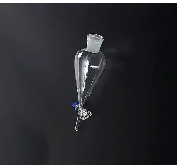 Воронка делительная грушевидная со стеклянным запорным краном и стеклянной пробкой, объём 500 мл изготовлена по ГОСТ 25336-82. Предназначена для переливания и разделения несмешивающихся жидких реагентов.