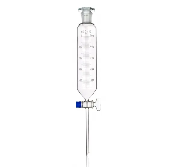 Воронка делительная цилиндрическая градуированная изготовлена из боросиликатного стекла, устойчивого к воздействию высоких температур и агрессивных химических веществ. Кран позволяет контролировать спуск жидкости при разделении несмешивающихся жидкостей. Пришлифованная пробка препятствует испарению летучих жидкостей в процессе разделения. Градуировка позволяет произвести точную оценку объёма жидкости.